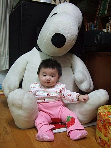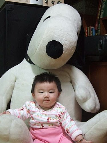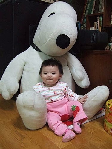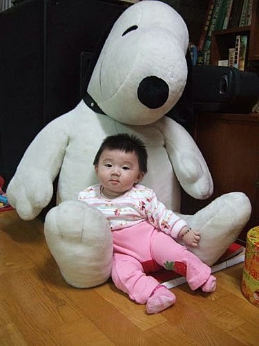 欣如阿姨家,有一隻"巨大"的史努比娃娃! 長的又高又胖喔! 我賴在史努比的身上,好溫暖喔! 史努比是我的好朋友喔!
