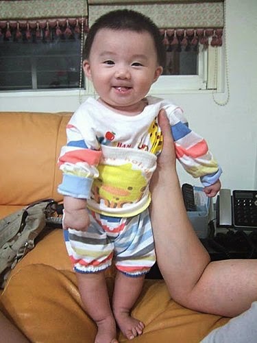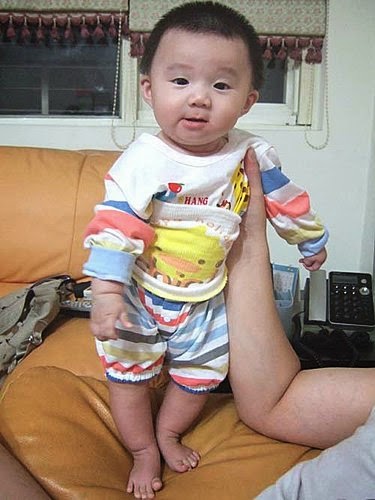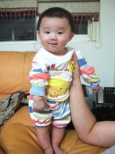 媽咪說:我長大了! 要訓練我的腿腿,站高高~ 爸比用一隻手撐著我! 讓我站在沙發的邊邊~ 爸比說:我好厲害!可以站好久喔~ 因為我每天在阿媽家,阿公都跟我玩”踢腳腳” 所以我的腳腳很有力喔! 在不久,我就可以跟爸比玩摔腳了~ 媽咪說:我好棒棒! 但是..不可以站太久! 因為我的腿腿還沒發育好~ 站太久,會變O型腿~以後就不能參加選美了!