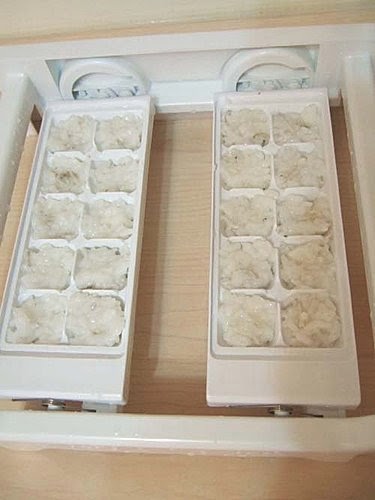 煮好的稀飯,分裝在"冰塊盒"裡...