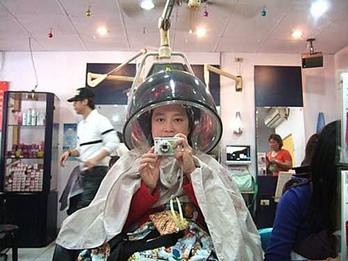 離子燙,工讀生小妹先上藥水(20分鐘)---->用機器哄頭(30分鐘)
