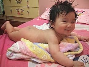 頭髮上的水滴..一直留下來了啦!!我要鎮定....媽咪快來幫我擦水水~~
