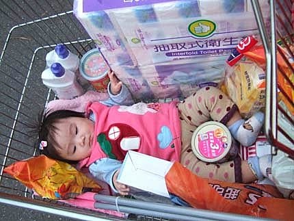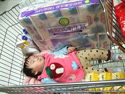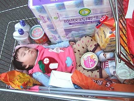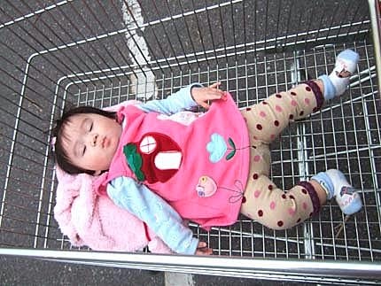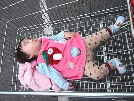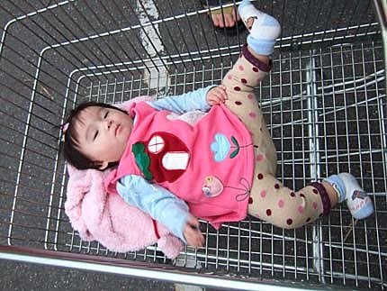 我就睡著了~~媽咪抱的手好酸,就把我放在購物車裡,搖呀~搖~好舒服喔!
