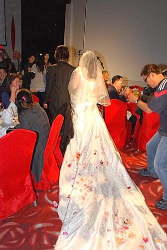 美麗的新娘子跟帥帥的新郎走紅地毯嚕,長長的裙擺~代表著長長久久喔!