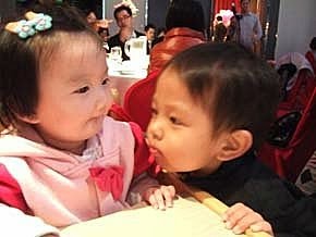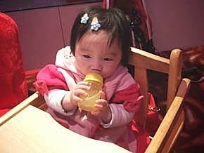 大家都吃完飯飯了,人家才剛坐上兒童餐椅而已耶!人家什麼都沒有吃到啦~