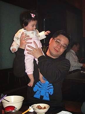 爸比~你吃飽就"恍神"想睡覺嚕,吃飽要做運動~我借你"舉重"一下啦!