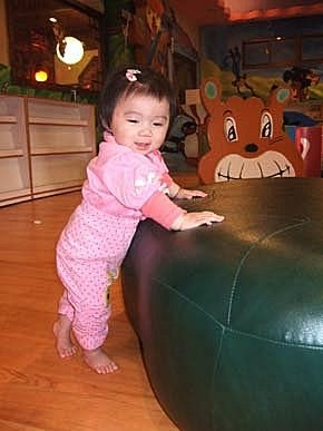 寶貝太小,實在不會玩,只能呆呆的坐著發呆,看著....大哥哥大姐姐們玩的滿頭大汗~