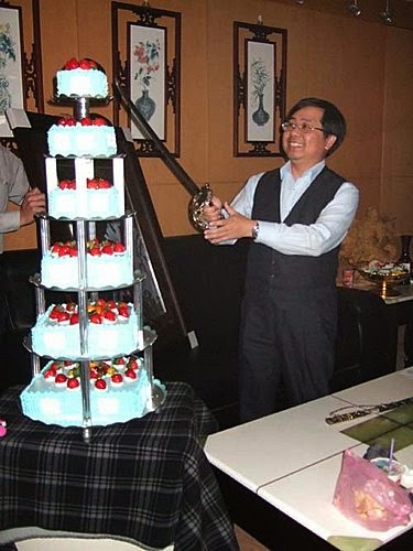 手上那把關刀.可不是用來坎人的,是用來切~~蛋~~糕~~啦!先許願.再想想看要怎麼切.