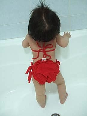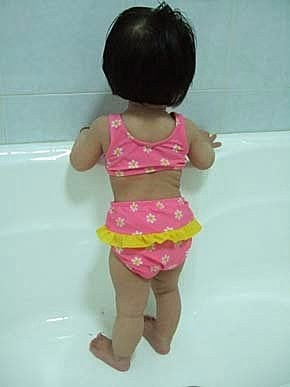 這是我的第二套"艷紅比基尼"有看過一歲的小孩,站"三七歩"嗎?就是本姑娘是也..
