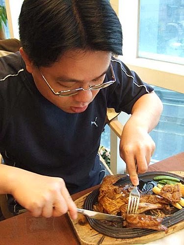 我點的羊肋俳..真是有夠難切!老公看不下去,自告奮勇來幫忙嚕!