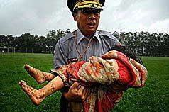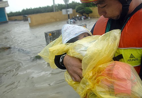 2009年8月9日,臺灣屏東。救難人員與小嬰兒相互凝視~