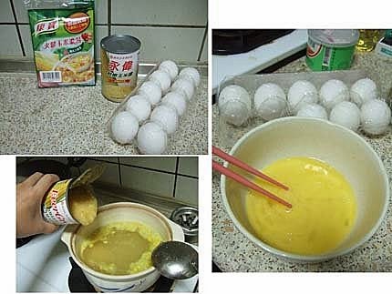 然後~打上幾個蛋,約十秒後...再去慢慢的~慢慢的攪拌,蛋就會成塊狀,變成又香又濃的玉米濃湯喔!