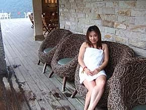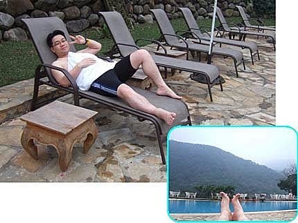 泡完湯,還有躺椅可以休息~吹著涼爽的風,配上美麗的景色!看到沒有?我們兩的大姆哥~通通比"讚"啦!