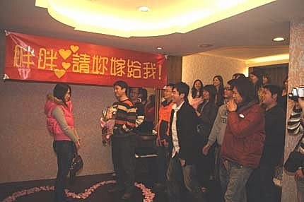 道具:求婚小熊花束 求婚紅布條 玫瑰花瓣 V8攝影機 數位相機 彩帶噴罐 大字報 愛的告白影片