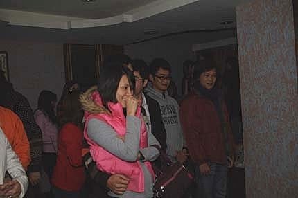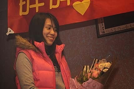 轉身看到紅布條的女主角,又是一臉驚喜!看著大家使出吃奶的力氣,用力的喊口號~忍不住...害羞的一直笑!(整個DV都是我的聲音)