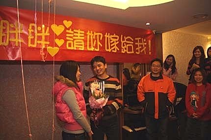 影片播放完畢!帶領女主角到...玫瑰花瓣布置的愛心裡,親友團男生組呼口號~女生主呼口號~
