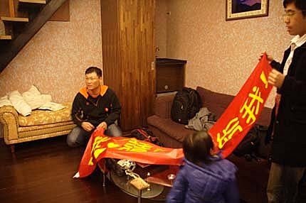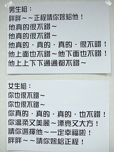 開始布置場地嚕~因為....口號無法要求大家一一背起來,所以~準備了"大字報"貼在女主角站立的後方,雖然事後穿幫了!還是覺得很有趣....