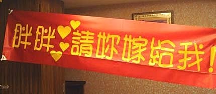 紅布條~是部門老大的緊急救火.....及時找廠商製作完成的,玫瑰花瓣上網訂,請同事熱心的去面交~