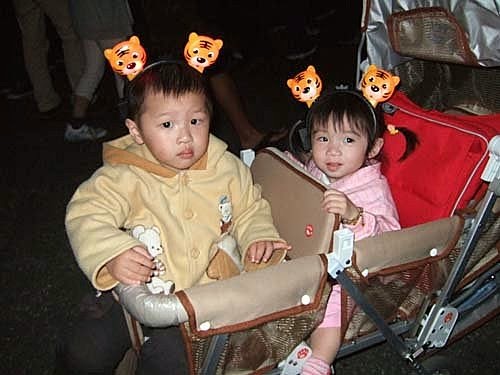 回家的路上,看到小販準備要收攤了~老虎燈飾三個100元,銷貨拍賣~趕緊買來給兩個小朋友{應景}一下唄!