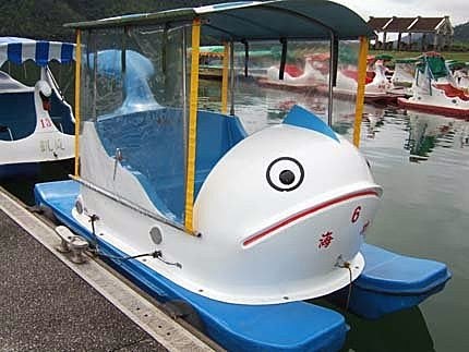 鯉魚潭還真不小,近百艘的小船出租,這還是其中一個店家而已呢!有分兩人座,四人座,不想自己踩,還有專人開小船載妳遊湖,費用不一!