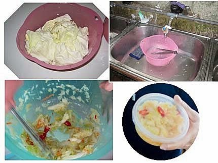 手洗淨~用力將白菜壓出湯汁來,瀝乾後,加入所有的調味料,攪伴均勻裝盒..放置兩小時,就很好吃了!店家也提供了盒子讓你可以帶回家享用~