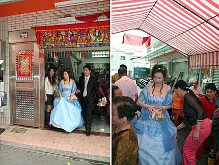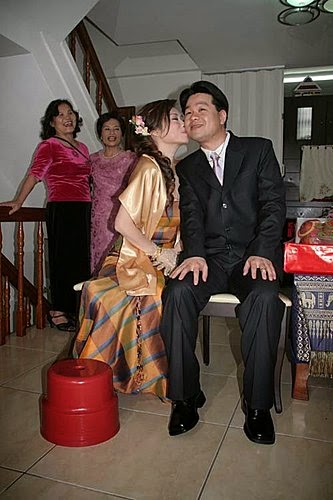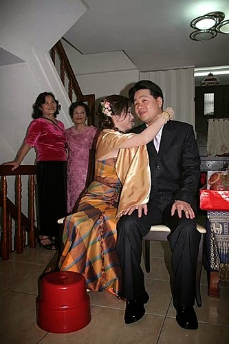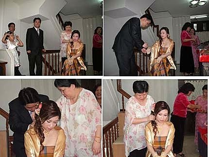 (3)在雙方家長與親友的福證下,準新娘面向外坐在正廳中的高椅上,腳放矮椅上(高椅坐,矮椅翹腳)(如係招贅則面向內)。