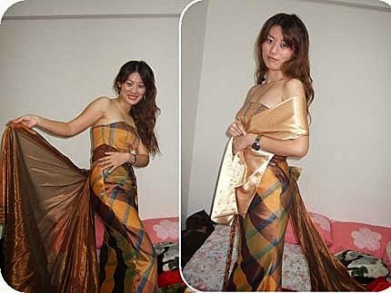 奉茶的時候,裙襬太長...差點絆倒,還好有穩住~我這一身的金色禮服和髮型,獲得不少好評呢!