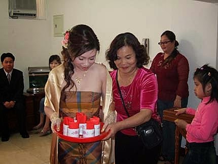 (2)新娘由一福氣婦人牽引出堂,捧著甜茶向男方來賓(雙數人數)一一敬茶,新娘此時才出場,杯數應與被奉茶人數相同,不可有多有少,媒人隨旁唸吉祥話祝福。