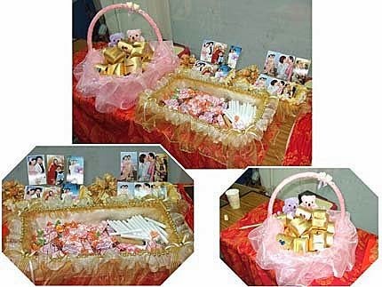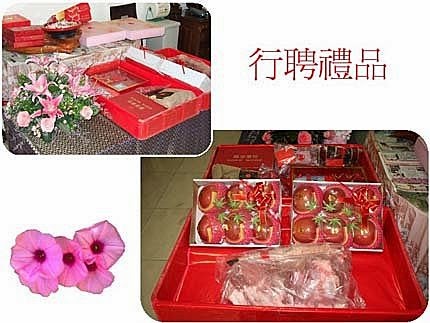 (1)男方工作人員抬春盛聘禮進入女方家客廳,女家接受聘禮賞予紅包(扛伕禮/車伕禮),並將聘禮一一陳列。