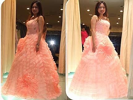 送客穿的粉橘色禮服,老媽超愛看我穿這一套,澎派的裙擺,非常的豪邁與喜感!我也很愛~怎麼..這兩套看起來,都比白紗優秀多了!