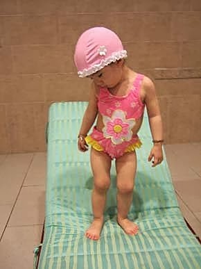 比起去年下水的經驗~嚎啕大哭,像無尾熊般抱著不放,今年...產生極大的變化!泳衣剛換上..泳帽還來不及戴,她就急著想狂奔水池裡~