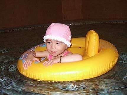 這次不但沒有哭鬧....還會潑我水...想放手...自己在游泳池裡"游走"玩到....冷的發抖了~還不肯上岸!