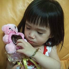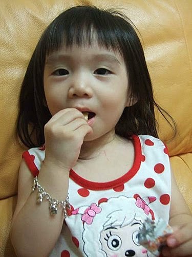 就在小熊金莎買回不到三分鐘,張小妹趁著爸比上廁所時....居然,偷偷把唯一的一顆金莎巧克力,自動分解...還吃得滿嘴黑嚕嚕~