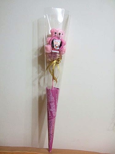 豈料...今天下午雷陣雨過後~老爺趕緊拎著張小妹,偷偷跑去花店買了一隻金沙小熊要幫我慶祝{情人節}