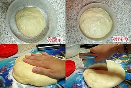 7.桌上灑些高筋麵粉,將發酵完成的麵團移出到桌面,表面也灑些高筋麵粉