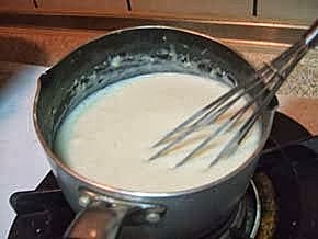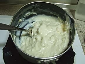 3.將鮮奶加熱後倒入做法2的鍋中,用力攪拌直至呈現無顆粒狀。