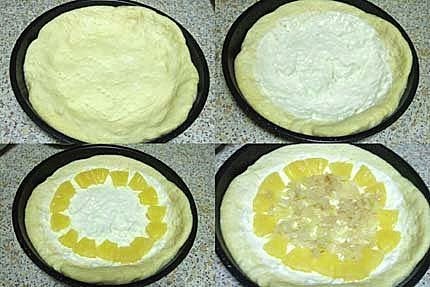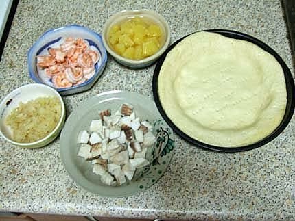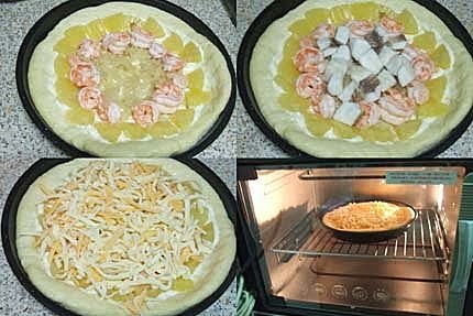 7.依序鋪上適量的洋蔥絲,鳳梨,蝦仁及魚片(蝦仁。魚片先燙熟,洋蔥先炒至透明狀)鳳梨片用罐頭