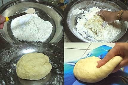 10.桌上灑一些手粉,將麵團桿開呈圓形,用手將麵皮慢慢拉扯成為薄片