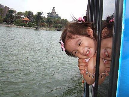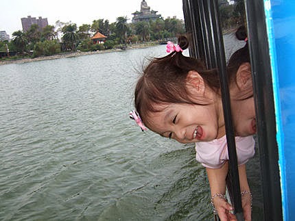 最興奮的應該是張小妹了,看到窗外的湖面...興奮得不得了!拼命往外鑽...就是要看車子在湖面遊走的樂趣,妹妹有練過的喔!小朋友不可以學喔~
