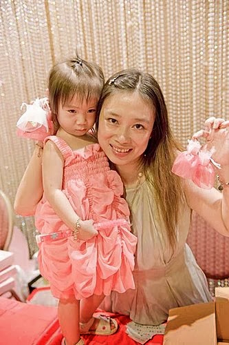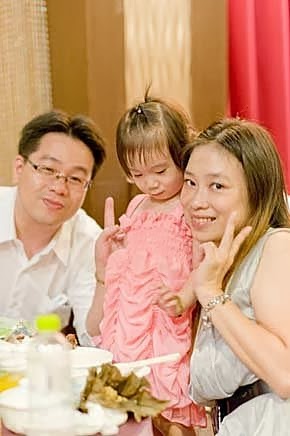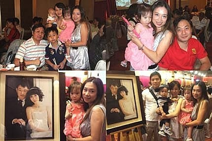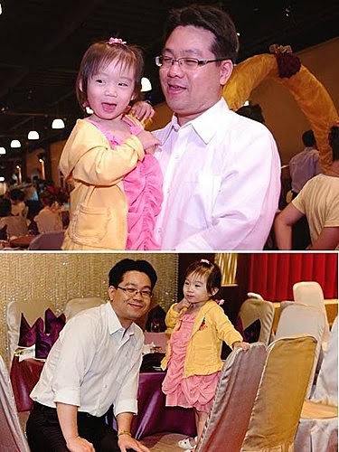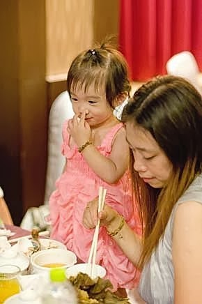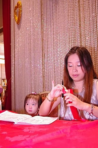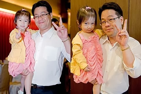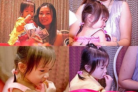 吃飽喝足....心情也開心啦!終於....願意去黏著她的爸比,讓我可以專心的收禮金~