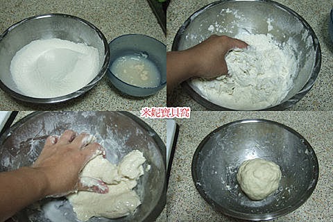 1.將所有材料攪拌搓揉成為一個沒有粉粒均勻的麵團