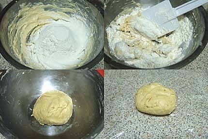 最後將過篩的粉類分2次加入使用括刀按壓的方式混合成團狀(不要過度攪拌避免麵粉產生筋性影響口感)