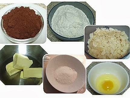 材料:無鹽奶油120g,細砂糖80g,牛奶1T,雞蛋1個,低筋麵粉230g,無糖可可粉40g.杏仁片150g,