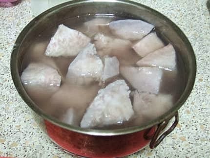芋頭遇水容易爛,所以使用用前才清洗.快速洗淨表皮的泥土,削皮後若發現內部有變色的地方必須挖除,以免影響口感.