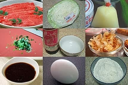 豬肉片100g,高麗菜5-6,青蔥1-2,山藥泥150g,雞蛋2,低筋麵粉150g,冷水100g,