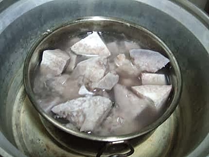 放入電鍋中,外鍋1杯水蒸煮1-2次至筷子輕易插入的程度(如果第一次蒸煮完沒有軟,外鍋再加1杯水蒸煮1)