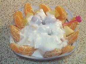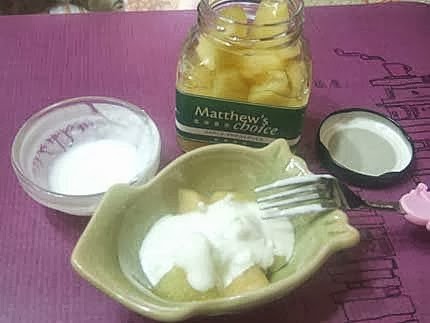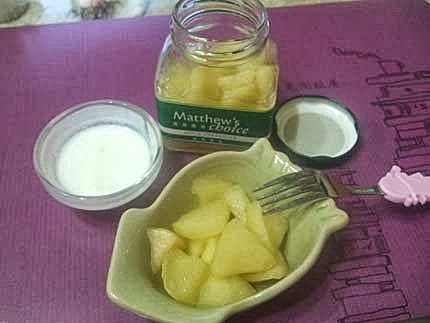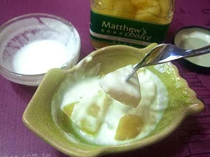 果肉淋上白白的優格,看起來就很可口...甘甜~甘甜~的好滋味,不愛吃甜食的老爺,很合他的胃口呢!