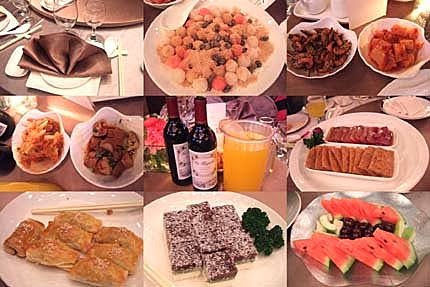 清蒸海上鮮 人蔘砂鍋燉全雞 蜜汁叉燒酥 鴛鴦紅豆糕 時鮮水果 每桌紅酒2瓶 果汁無限暢飲