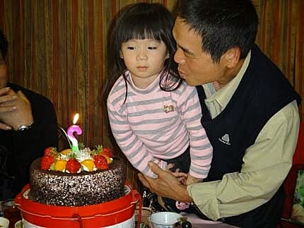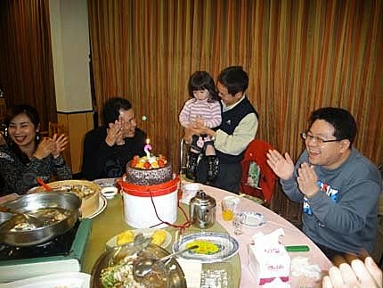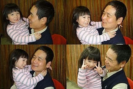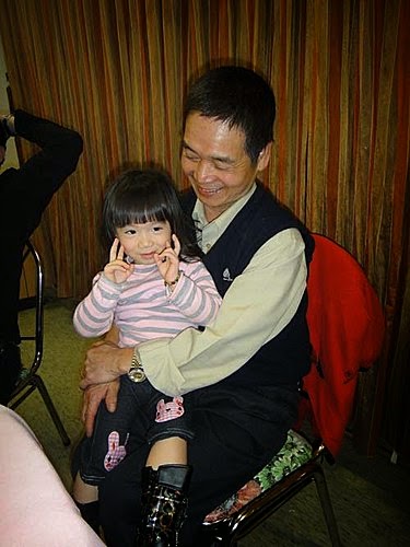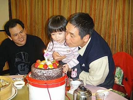 外公抱著我一起唱生日歌!一起吹蠟燭...好像是我在過生日喔...真害羞!