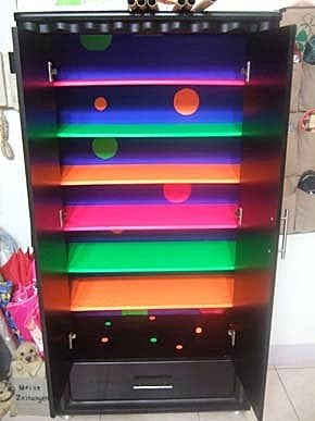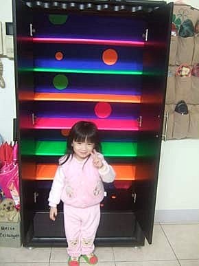 首先!去五金百貨行....買了鮮豔的壁貼,把鞋櫃中所有的層板卸下來,貼上鮮豔的貼紙包裝!