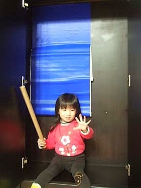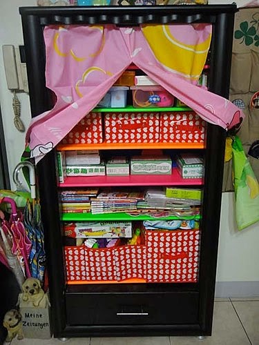 拿掉厚重的門片...因為常常開合,絞鏈已脫落....為了避免發生危險~換上可愛的門簾,超卡哇伊的"玩具櫃"完工啦!